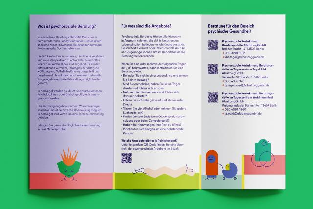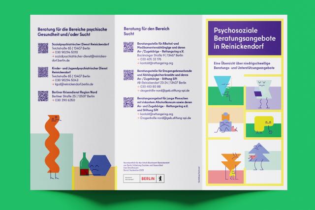 Viele Menschen mit psychischen Belastungen oder Suchterkrankungen stoßen noch immer auf Vorurteile und Hürden, Hilfsangebote sind oftmals schwer zugänglich, und es ist nicht immer leicht zu erkennen, welche Unterstützung im individuellen Fall passen könnte. In Zusammenarbeit mit dem Bezirksamt Berlin-Reinickendorf entwickelten wir eine Kampagne, die über niedrigschwellige psychosoziale Angebote des Bezirks aufklärt. Mittels Illustrationen und fröhlich anmutenden Farben vorbildlichen wir auf eine emphatische Weise Symptome persönlicher Krisen, Krankheitsbilder oder psychischer Schwierigkeiten.