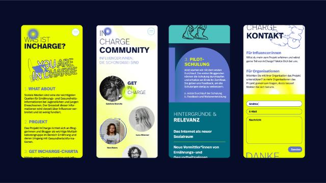 InCHARGE ist ein Projekt, das sich für fundierte Gesundheitskommunikation in sozialen Medien einsetzt. Unsere Auftraggeberinnen möchten hierbei mit InfluencerInnen zusammenarbeiten und ihnen Ressourcen an die Hand geben, mit denen sie ihre Informationen besser fundieren können und somit mehr Verantwortung für einen förderlichen Gesundheitsdiskurs in sozialen Medien übernehmen können. Für dieses Projekt wurden wir neben der Gestaltung des Logos für ein frisches, wildes und dennoch gut navigierbares UX/UI-Design beauftragt, das wir mit passenden Illustrationen abrundeten.